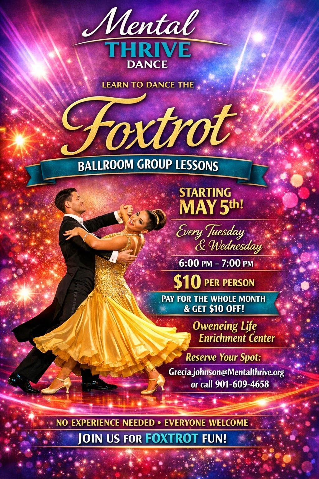 At MentalThrive, we blend mental health coaching, movement, and mind-body connection to help you rediscover confidence, clarity, and joy. Whether through coaching, ballroom-inspired wellness, or community workshops, you’ll find a safe space to grow into the healthiest version of yourself.